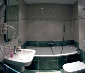 Großes Bad mit großem Waschbecken, moderner Dusche, Badewanne und WC